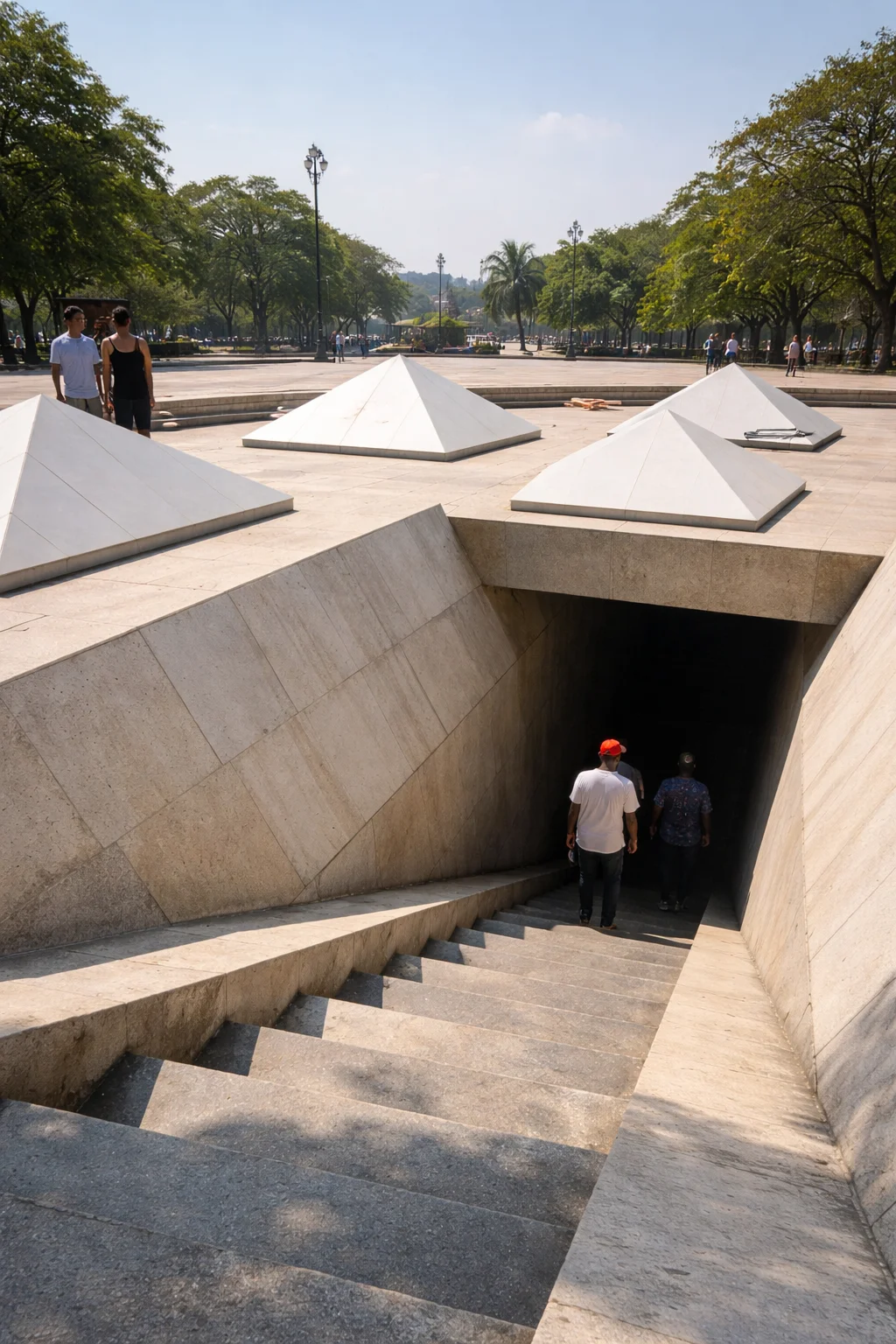 The architecture of MUPANAH is deliberate and laden with symbolism. Designed by the renowned Haitian architect Albert Mangonès and inaugurated in 1983, the building is constructed primarily underground. From the surface, the most visible elements are the white, inverted pyramidal cones that serve as skylights, illuminating the crypt and galleries below. These geometric forms are often interpreted as referencing the indigenous Taíno culture or the flames of the revolution, merging modernism with ancestral motifs.